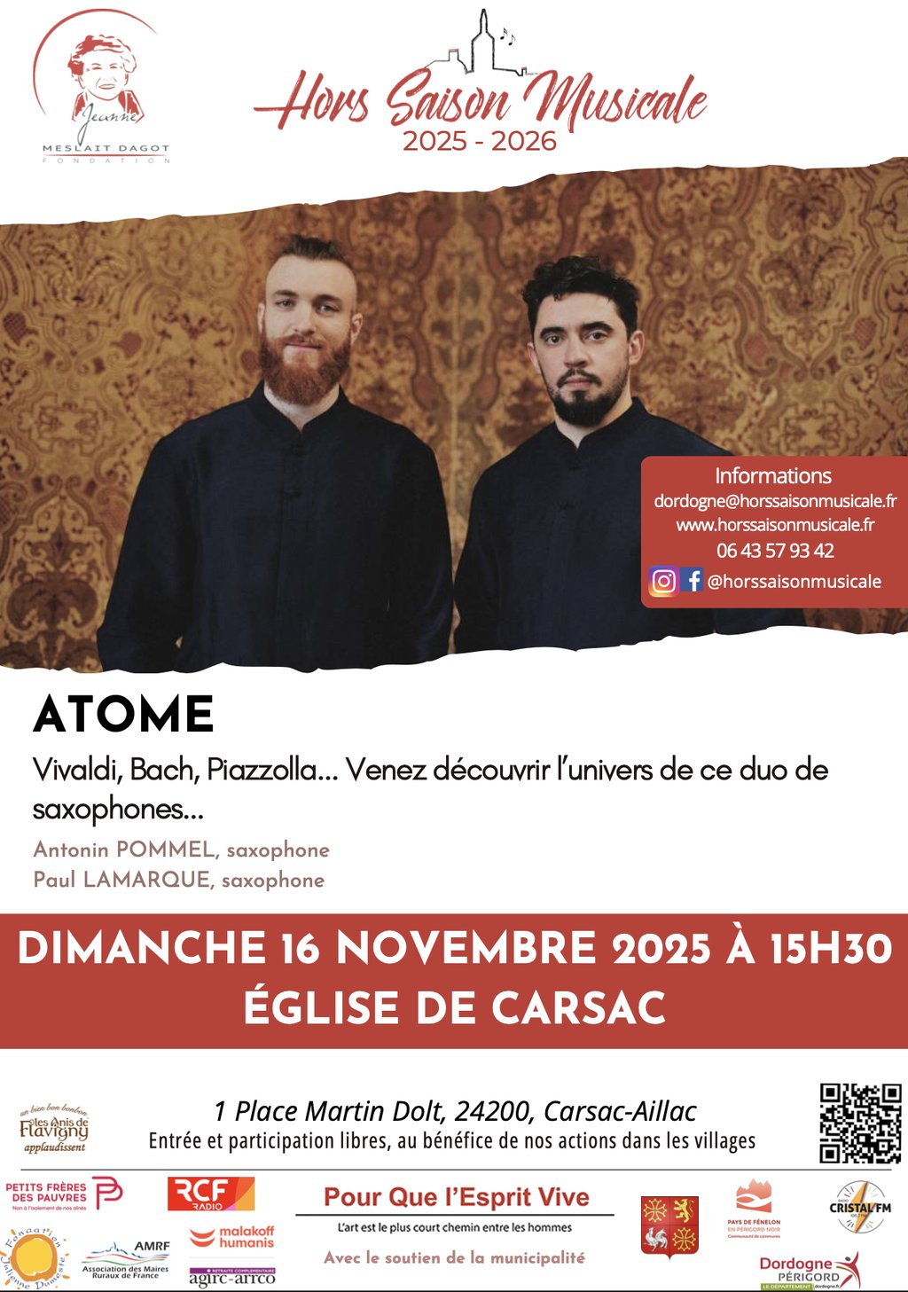 🎷Hors Saison Musicale vous invite au concert du "duo Atome" composé de Antonin POMMEL et Paul LAMARQUE (saxophone), le dimanche 16 novembre à 15 h 30, à l’église de Saint-Caprais à Carsac !