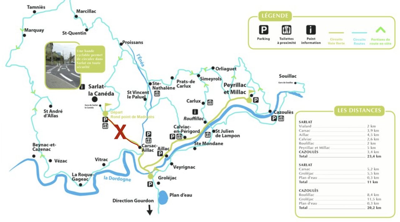 ⛔️Dans le cadre de travaux de sécurisation d'un accotement de chaussée de la voie verte, la piste cyclable sera interdit à la circulation sur le tronçon La Canéda - Mairie de Carsac-Aillac.